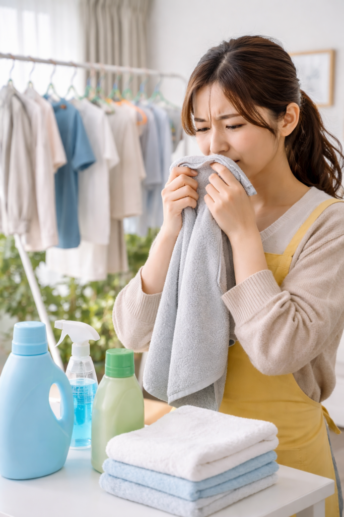 いわゆる生乾き臭の典型で、乾燥の早さを改善することがいちばんの近道になります。
